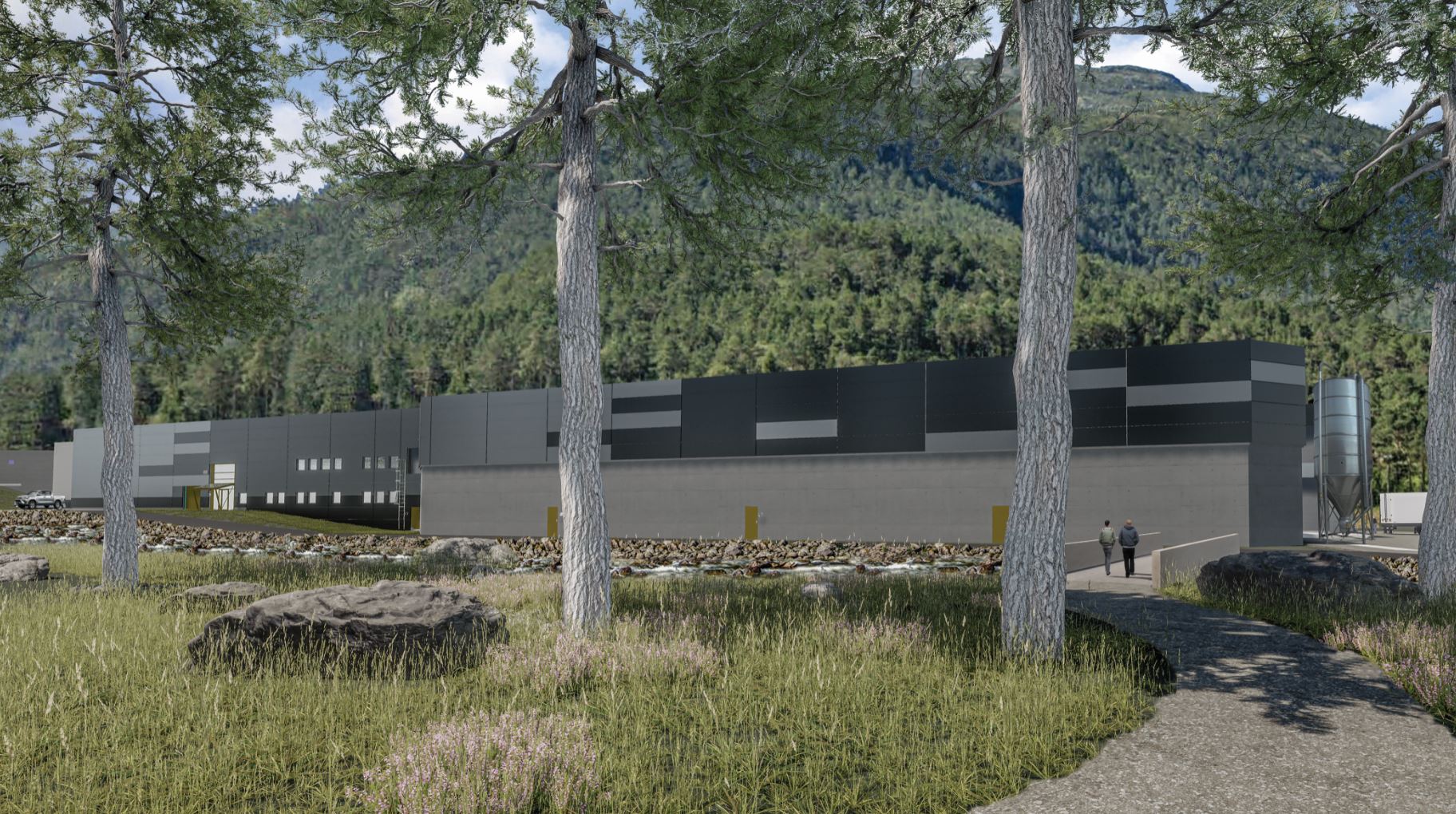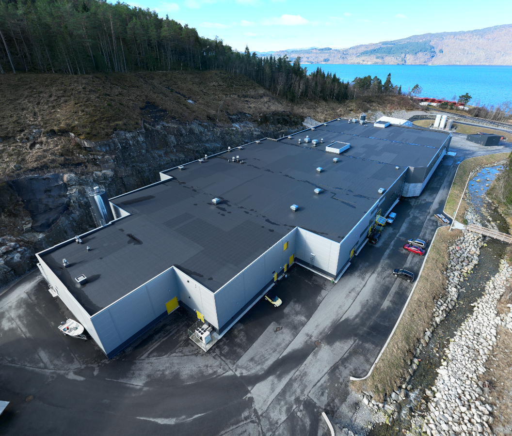 Nybygg for Ænes Inkubator ved Hardangerfjorden. Prosjektet er et av Norges største og mest moderne resirkuleringsanlegg for smoltproduksjon, med et bruttoareal på ca. 10 000 m².